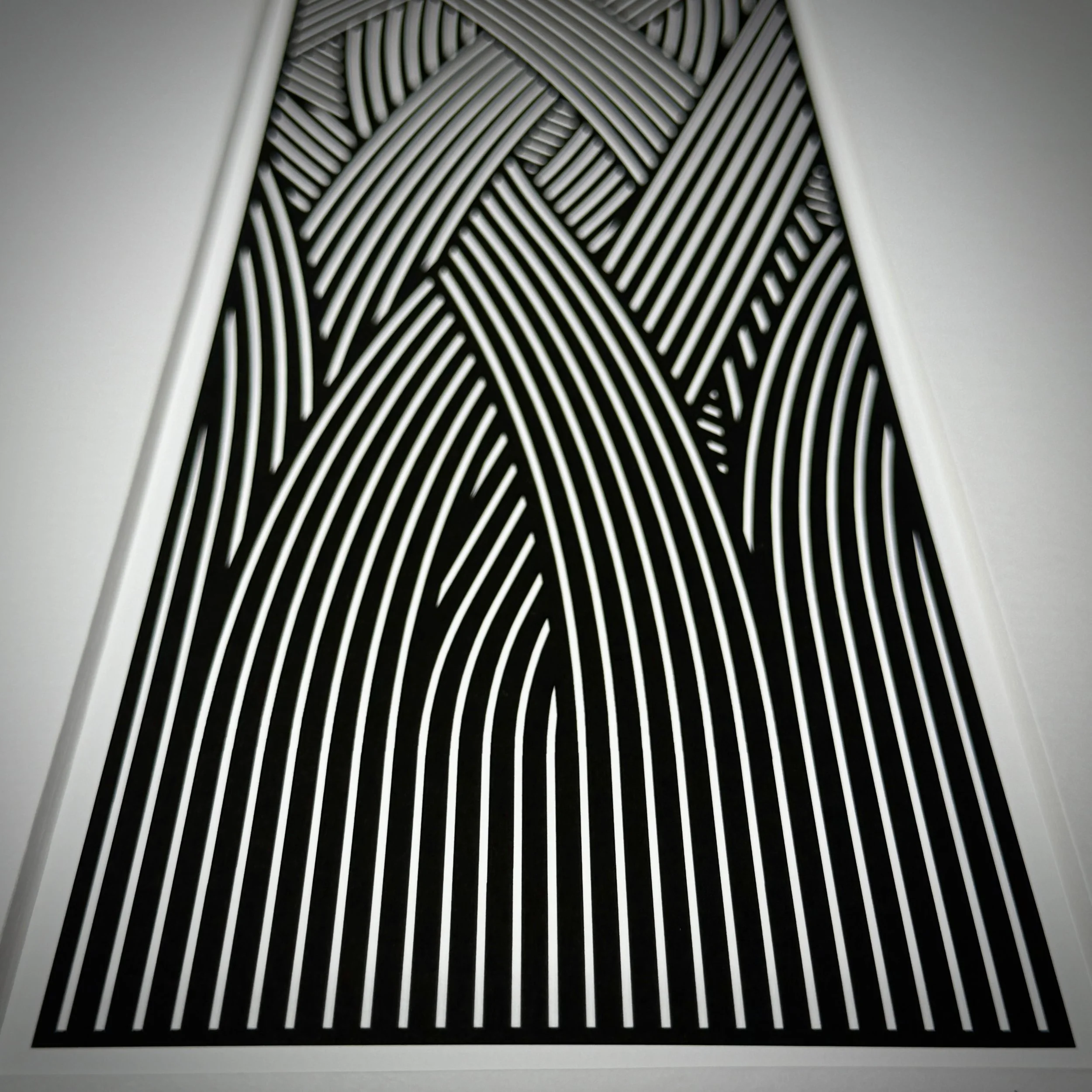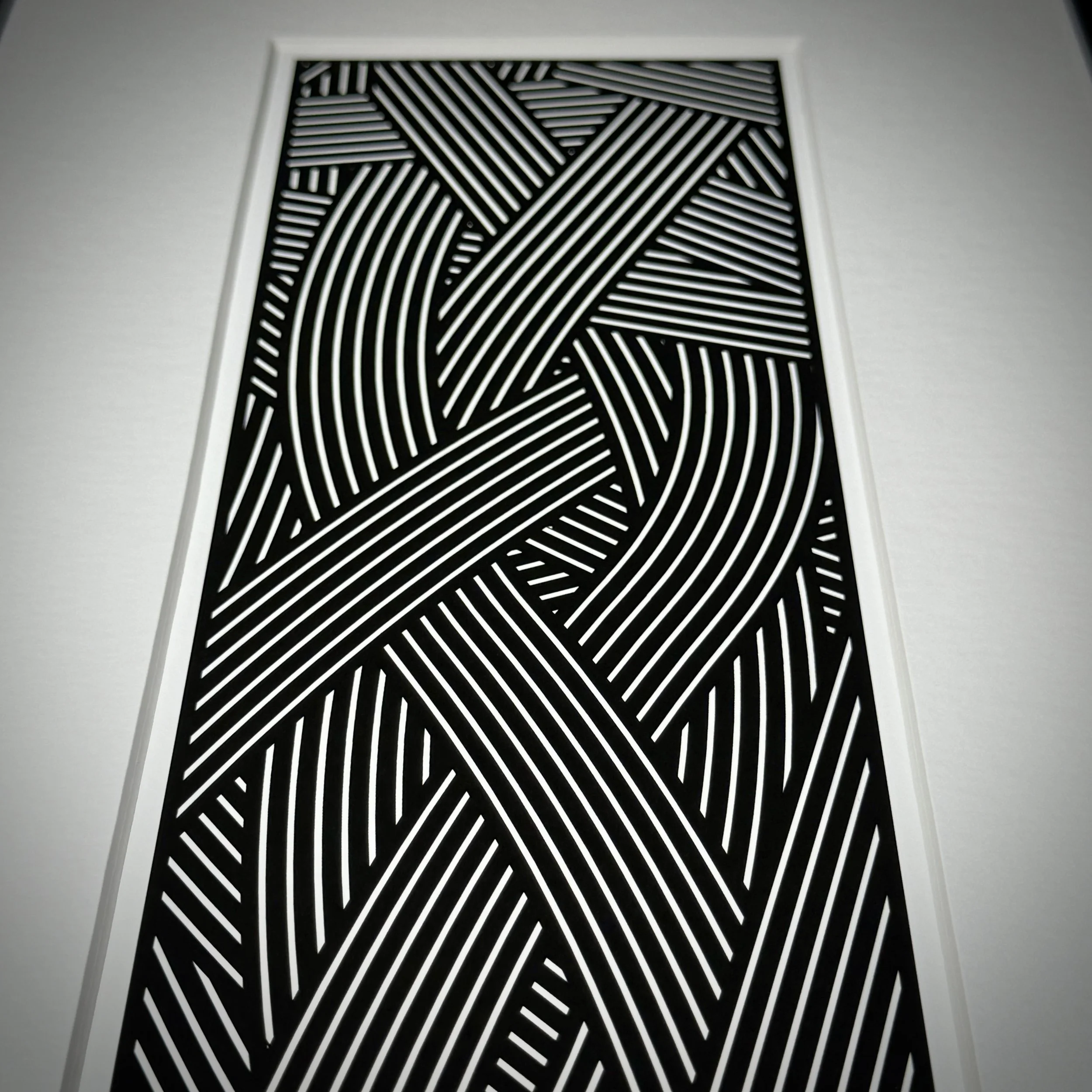 Black frame 25” x 10.75”, glass, and a thick white beveled matt matt with a 3.1875” x 18.125” opening and matt black pigment ink printed on archival paper.
