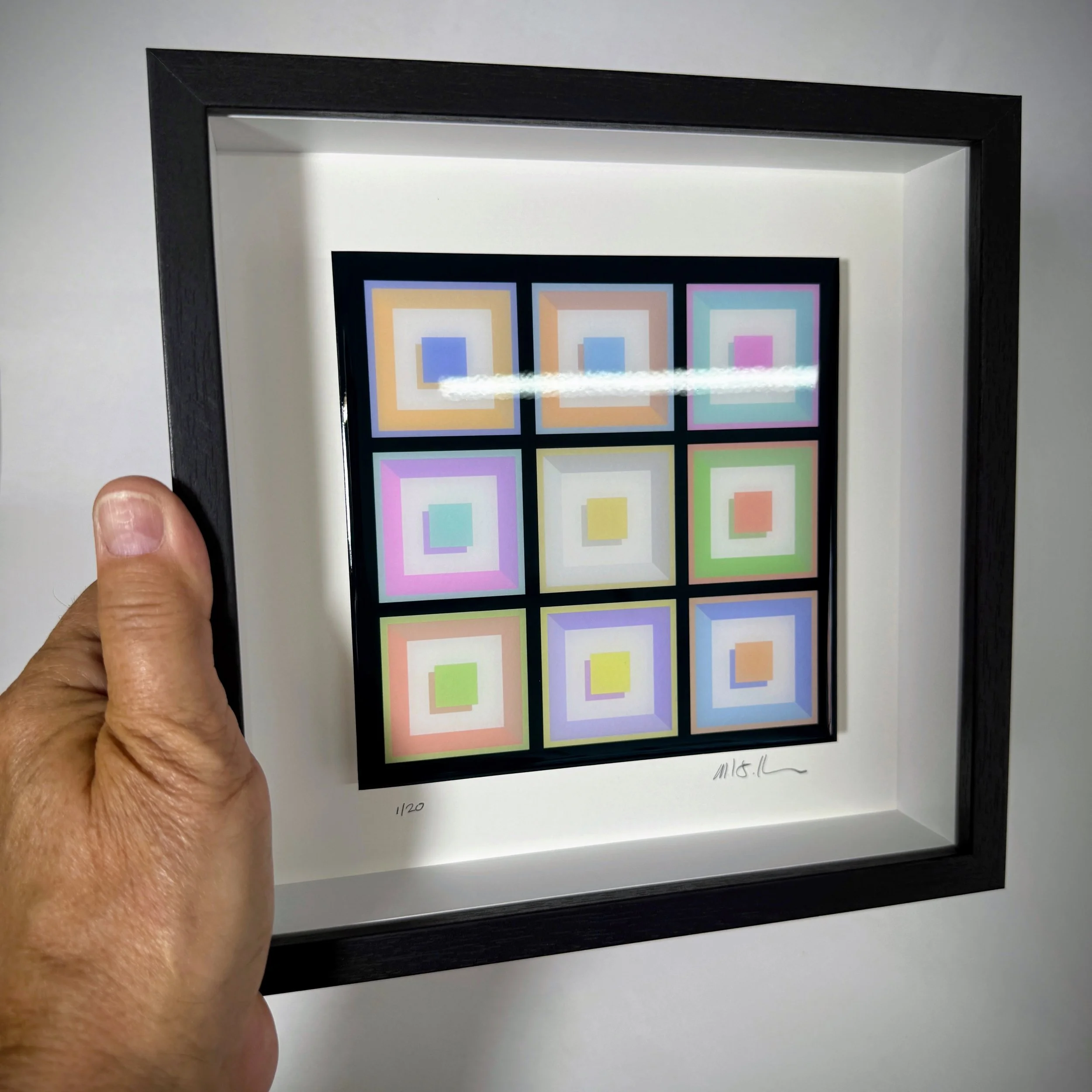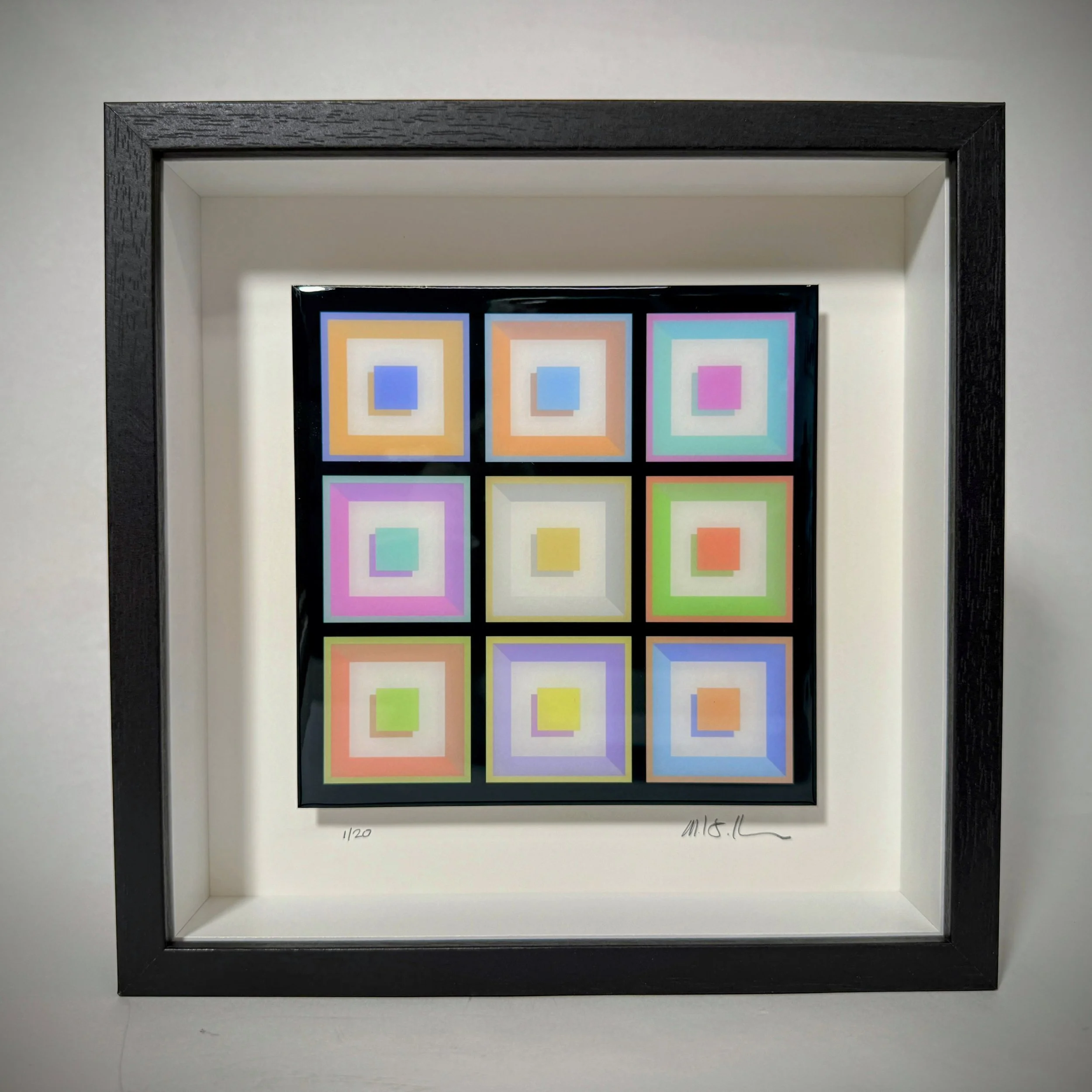 Soft colors of architectural ceiling coffers, each with complementary colors and an expression of shadows for depth. The print is covered with a clear epoxy resin finish to enhance the color, provide a reflective surface and visual depth to the artwork. Signed and numbered by the artist as part of a limited edition of 20.